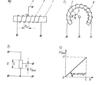 К зажимам обмотки реостата подключается напряжение Uпостоянного или переменного тока неизменного значения. При перемещении движка выходное напряжение UВЫХ меняется пропорционально входной величине Х. Таким образом осуществляется преобразование перемещения в напряжение (рис. 9.8,в).