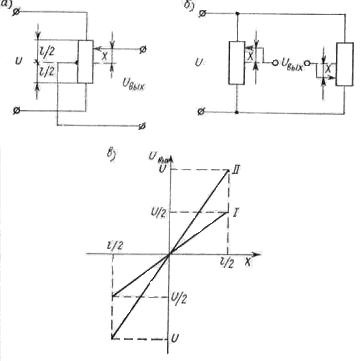Как следует из приведенной статической характеристики, рассмотренные преобразователи относятся к однотактным элементам, т. е. они не реагируют на знак входного сигнала. В ряде случаев необходимы преобразователи, учитывающие знак входного сигнала, - двухтактные измерительные преобразователи. Их можно построить на основе однотактных потенциометрических преобразователей если снимать выходной сигнал с движка и средней точки потенциометра или с диагонали мостовой схемы, образованной двумя потенциометрическими датчиками со средней точкой. Две из возможных схем включения потенциометрических датчиков по двухтактной схеме приведены на рис. 9.9,а,б. Их статические характеристики (рис. 9.9, в) отличаются разной крутизной. Это объясняется тем, что при включении преобразователей по мостовой схеме (рис. 9.9,б), изменение входного сигнала отрабатывается двумя движками, смещающимися в разные стороны от средней точки. Это приводит к появлению удвоенного выходного напряжения (прямая II), по сравнению со схемой, представленной на рис. 9.9, а (прямая I, рис. 9.9, в).