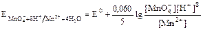 а). В реакции участвует кислородсодержащий окислитель. В этом случае ионы водорода принимают непосредственное участие в реакции и концентрации ионов водорода следует ввести в формулу Нернста в степени стехиометрического коэффициента в числитель под знаком логарифма.