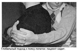 Пациент сидит на краю стола. Врач сидит сбоку, верхом на столе (со стороны наибольшей плотности). Врач устанавливает плечо пациента вплотную к своей груди, на уровне дельтовидно-грудной бороздки. Руки врача лежат на противоположном плече пациента, пальцы перекрещены.