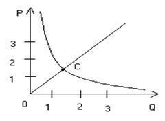 Имея некоторые представления о спросе и предложении, перейдем к анализу их взаимодействия. Совместим линии спроса и предложения. Линия DD является графическим изображением функции спроса от цены, а линия SS – функции предложения от цены. Точка С-точка равновесия рынка. Равновесная цена - это цена, уравновешивающая спрос и предложение.