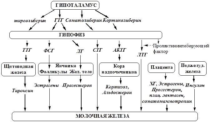 Эстрогены, а также СТГ, инсулин, кортикоиды, тиреоидные гормоны стимулируют рост и деление молочных протоков, рост сосудов и стромы. Прогестерон запускает превращение эпителиальных клеток в ацинус (альвеолы).