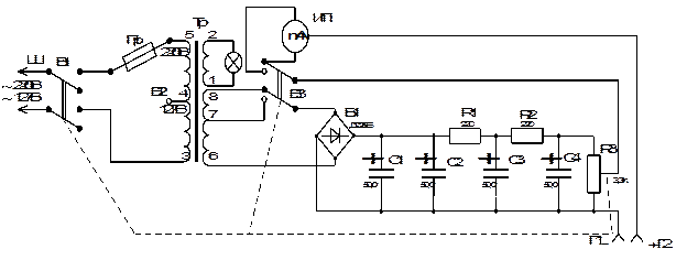 Аппарат представляет собой питаемый от сети регулируемый источник постоянного тока (рис. 2). Питание аппарата от сети производится через трансформатор Тр. Напряжение вторичной обмотки (выводы 6-8) подается на выпрямитель, собранный по мостовой схеме на блоке диодов Б1. Фильтрация осуществляется двухзвенным резистивно-емкостным фильтром на электролитических конденсаторах С1-С4 и резисторах R1, R2. Эффективность фильтра такова, что даже в случае значительного уменьшения со временем емкости конденсаторов обеспечивается пульсация выходного тока не более 0,5%. Это необходимо, чтобы в максимальной степени исключить переменную составляющую, имеющую иное физиологическое действие, чем постоянный ток.
