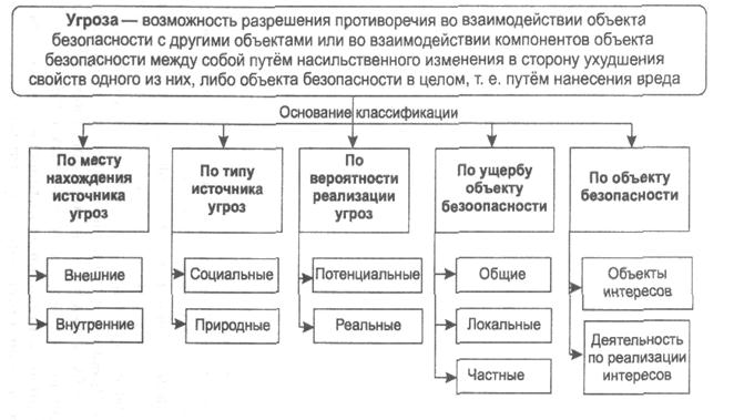 Угроза – есть совокупность факторов и условий, возникающих в процессе взаимодействия объекта безопасности с другими объектами, а также составляющих его компонентов между собой и способных оказывать на него негативное воздействие. Она выступает в качестве возможности разрешения противоречия во взаимодействии объекта безопасности с другими объектами, компонентов объекта безопасности, находящихся в стадии дисгармонии или конфликта, путем насильственного изменения в сторону ухудшения свойств объекта безопасности, либо его компонентов, т.е. путем нанесения вреда.