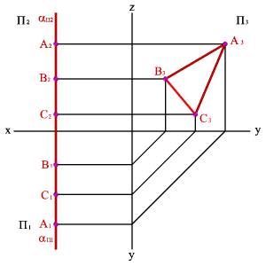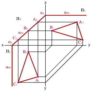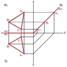 1. Плоскость не перпендикулярная ни одной плоскости проекций называется плоскостью общего положения. Такая плоскость пересекает все плоскости проекций (имеет три следа: - горизонтальный aП1; - фронтальный aП2; - профильный aП3).