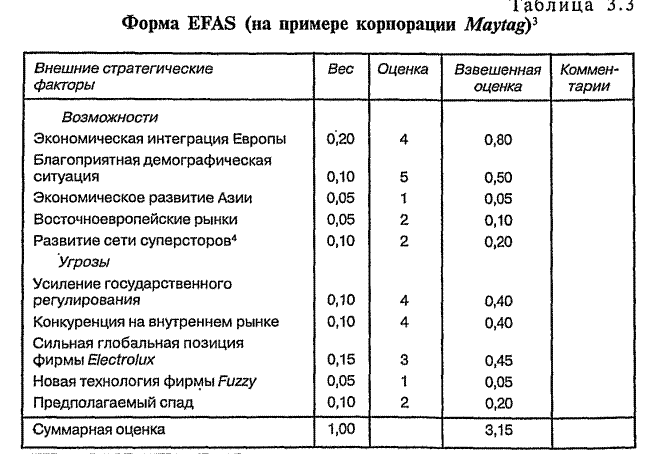 Для обобщения результатов работы по анализу стратегических факторов внешней среды западные специалисты предлагают использовать специальную форму «Резюме анализа внешних стратегических факторов» (External Strategic Factors Analysis Summary — EFAS)(табл. 3.3).