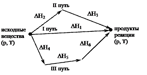 Тепловой эффект реакции, протекающей при постоянном давлении (Qp = DН) или при постоянном объеме (QV = DU) и постоянной температуре, определяется только природой и состоянием исходных веществ и продуктов реакции и не зависит от пути перехода от исходных веществ к продуктам реакции (т.е. реакцию можно проводить в одну, две, три и т.д. стадии).