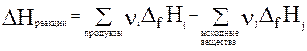 Тепловой эффект реакции равен разности между суммой теплот образования из простых веществ (DfH) продуктов реакции и суммой теплот образования из простых веществ исходных веществ (с учетом стехиометрических коэффициентов).
