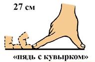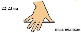 Пядь (18... 19 см) означало кисть руки на древнерусском языке. Это максимальное расстояние по прямой между концами вытянутых большого и указательного пальцев кисти руки. Пядь часто употребляли в обиходе для приближенного определения небольших длин, особенно размеров цилиндрических тел.