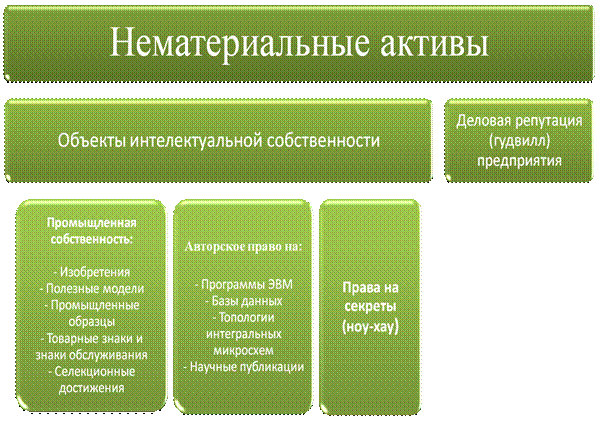 Нематериальные активы, получившие правовую защиту, называются интеллектуальной собственностью, которая обычно разделяется на следующие крупные категории: патенты, авторские права (копирайт), товарные имена (знаки, формы), коммерческие секреты и ноу-хау [99].