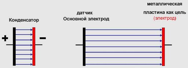 - в зону датчика помещен металлический объект или меняется расстояние между пластинами-электродами: