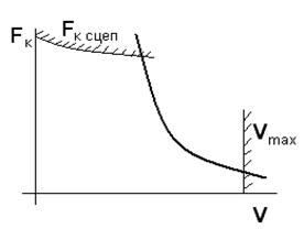 Тяговая характеристика локомотива имеет ограничение силы тяги по сцеплению колес колесных пар с рельсами и ограничение силы тяги по максимальной скорости движения.