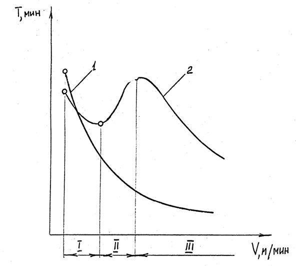 Связь между скоростью резания и периодом стойкости в зависимости от рода обрабатываемого и инструментального материалов может выразиться монотонно убывающей кривой (1) или более сложной кривой (2). Кривая 1 характерна для обработки чугуна и стали резцами из быстрорежущей стали и твердого сплава группы ВК (рис. 35.).
