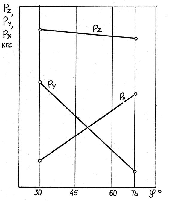 Увеличение радиуса переходного лезвия r вызывает уменьшение переходных углов в плане в различных точках лезвия, вследствие этого силы Pz и Py увеличиваются, причем сила Рz в меньшей степени, а сила Рx - уменьшается (рис 34.).