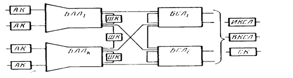 На рис. 33 приведена упрощенная схема коммутационной системы квазиэлектронной АТС. Система содержит четырехзвенные блоки БАЛ и БСЛ. К входам БАЛ через абонентские комплекты (АК) подключены абонентские линии, к выходам— линии к БСЛ и шнуровые комплекты (ШК). К выходам БСЛ через исходящие (ИКСЛ) и входящие (ВКСЛ) комплекты подключены соединительные линии к другим АТС и узлам. Кроме указанных комплектов
