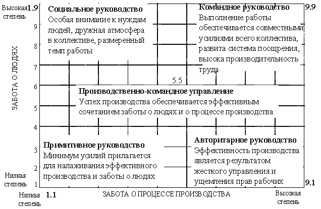 9.9. – команда. Благодаря усиленному вниманию к подчиненным и эффективности, руководитель добивается того, что подчиненные сознательно приобщаются к целям организации. Это обеспечивает и высокий моральный настрой, и высокую производительность. Эта позиция характеризует такой тип руководителя, который одинаково бережно относится как к людям, так и к возглавляемому им производству.
