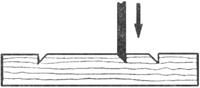 | 3. Установить долото, расположив лезвие перпендикулярно волокнам древесины с левой стороны размеченного отверстия; перерезать волокна и вынуть долото | Фаска долота должна быть обращена внутрь размеченного отверстия, отступив на 1-2 мм от линии разметки; слегка ударяя киянкой по ручке долота, его лезвие вводят в древесину на 3-5 мм |