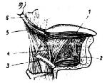 1 – мягкое нёбо; 2 – надгортанник; 3 – трахея; 4 – пищевод