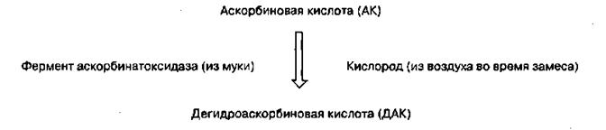 На первой стадии аскорбинатоксидаза катализирует окисление аскорбиновой кислоты с превращением ее в дегидроаскорбиновую кислоту ДАК. Необходимый для этого кислород поступает из газовых пузырьков, попадающих в тесто во время замеса.