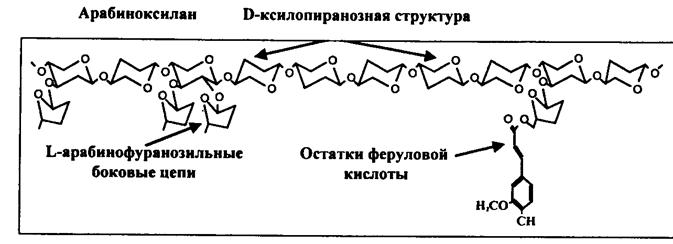 Дополнительное воздействие перекиси водорода заключается в модификации некрахмальных углеводов второго порядка. В соответствие с теорией Л. Хилхорста и др. возможно образование поперечных связей арабиноксилана при помощи феруловой кислоты с другими арабиноксиланами. Окисление феруловой кислоты приводит к образованию дополнительных связей (дополнительное связывание феруловой кислоты), способствует гелеобразованию, увеличивает гидратацию, в результате чего возрастает водопоглотительная способность теста (рис. 6).