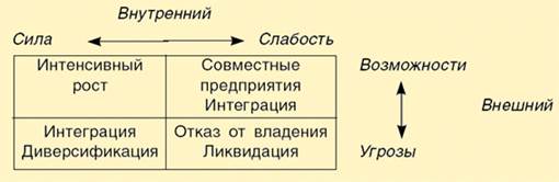 Непосредственно разработка стратегических вариантов, соответствующих внутренним параметрам фирмы и его положению на рынке и в целом во внешней среде, производится путем построения матриц корреляционного SWOT-анализа. На рисунке 5.5 приведен пример такой матрицы для выбора корпоративной стратегии.