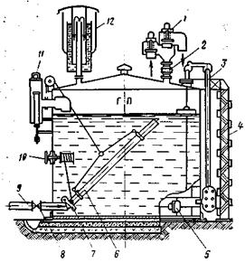 1 – дыхательный клапан; 2 – огневой предохранитель; 3 – уровнемер дистанционный универсальный; 4 – маршевая лестница; 5 – люк-лаз; 6 – шарнирная подъемная труба; 7 – хлопушка; 8 – задвижка; 9 – приемно-раздаточный коллектор; 10 – управление хлопушкой; 11 – пенокамера; 12 – предохранительный клапан