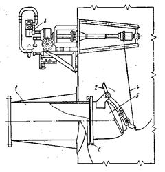 1 – приемно-раздаточный патрубок; 2 – хлопушка; 3 – электроприводной механизм управления; 4 – стальной канат; 5 – пропускное отверстие; 6 – прокладка