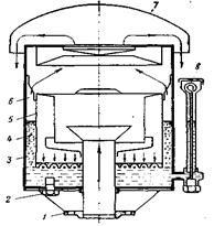 1 – приемный патрубок; 2 – пробка; 3 – корпус клапана; 4 – незамерзающая жидкость; 5 – колпак; 6 – межтрубное пространство; 7 – крышка; 8 – указатель уровня незамерзающей жидкости