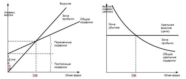 В точке безубыточности выручка равна общим издержкам, прибыль равна нулю, а маржинальный доход – постоянным издержкам.