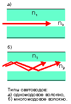 Важнейший из компонентов ВОЛС - оптическое волокно. Для передачи сигналов применяются два вида волокна: одномодовое и многомодовое. Свое название волокна получили от способа распространения излучения в них. Волокно состоит из сердцевины и оболочки с разными показателями преломления n1 и n2.