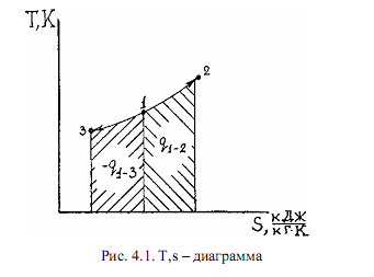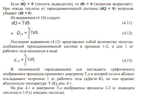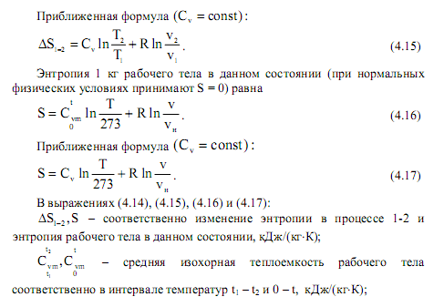 Площадь под линией процесса в соответствии с (4.13) соответствует теплоте процесса в расчете на 1 кг рабочего тела (кДж/кг). Изменение энтропии в термодинамическом процессе идеального газа подсчитывается по следующей формуле: