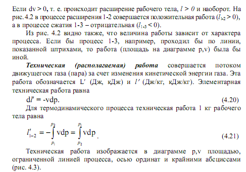 При исследовании различных термодинамических процессов рассматривают два вида внешней работы: работу изменения объема и работу техническую (располагаемую). Работа изменения объема совершается при любом изменении объема неподвижного газа. Эта работа обозначается L (Дж, кДж) и l (Дж/кг, кДж/кг). При элементарном изменении объема 1кг газа dv соответствующая элементарная работа равна