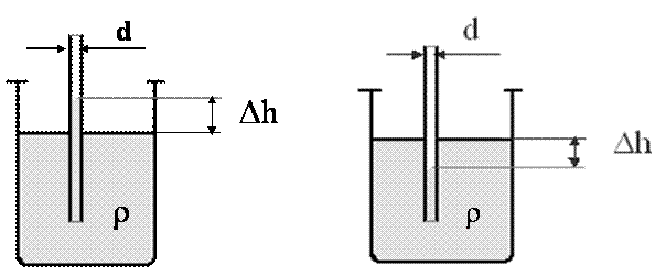 Эти дополнительные напряжения легко наблюдать, если в сосуд с жидкостью погрузить капилляр. В этом опыте возможны два варианта. В первом случае жидкость, за счёт поверхностных сил, поднимется по капилляру на некоторую высоту. Тогда говорят о капиллярном поднятии, и наблюдается явление смачивания.