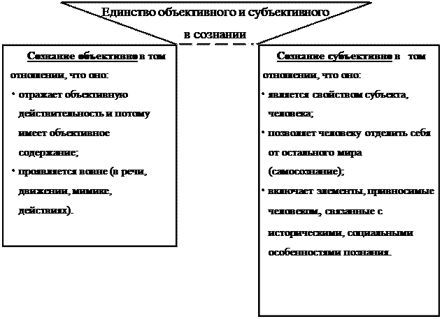 Указывается на естественные и социальные предпосылки возникновения и развития сознания. К первым относится прежде всего способность человеческого мозга как высокоорганизованной материи отражать явления действительности, ко вторым – человеческая предметно – практическая деятельность и речь. В процессе этой деятельности происходит диалектическое взаимодействие мыслящего субъекта (человека как социального существа) и разного рода объектов, вовлекаемых в сферу его деятельности, с которыми он так или иначе взаимодействует. То есть, реально преобразуя мир, человек осмысливает его, все глубже познает свойства и отношения многих явлений.