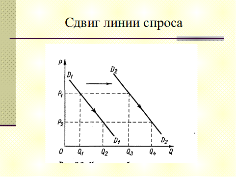 При прочих равных условиях(постоянстве величины цены на данный товар) на изменение спроса оказывают влияние неценовые факторы. Если изменение цены товара приводит к изменению объёма спроса и движению вдоль кривой спроса, то изменение неценовых факторов приводит к сдвигу кривой спроса вправо – влево(рис. 2,3).