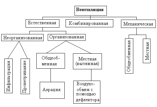 Вентиляция – это комплекс взаимосвязанных устройств и процессов, предназначенных для создания организационного воздухообмена, заключающегося в удалении из производственного помещения загрязненного или перегретого (охлажденного) воздуха с подачей вместо него чистого и охлажденного (нагретого) воздуха, что позволяет создать в рабочей зоне благоприятные условия воздушной среды.