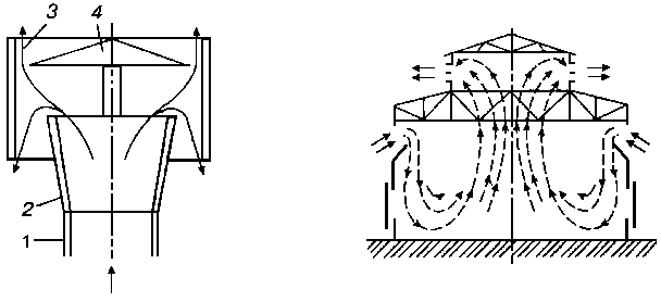 Дефлектор является оголовок, которым заканчивается труба, предназначенная для удаления воздуха из верхней зоны помещения. Поток ветра, ударяясь о дефлектор и обтекая его, создает вокруг большой части его периметра разряжение, обеспечивающее подсос воздуха из помещения по каналу дефлектора.