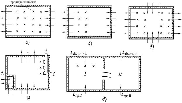 а, б, в – общеобменная; г – общеобменная и местная; д – организация воздухообмена; I – помещение пульта управления; II – местные отсосы.