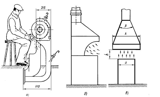 а – местный отсос-кожух от шлифовального станка; б – вытяжной шкаф;