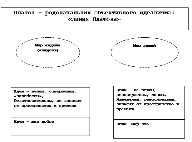 Об идеях Платона. Платон стремится развить сократовские представления. Идея вещи есть смысл вещи, есть такая цельность всех отдельных частей и проявлений вещи, которая уже не делится на отдельные части данной вещи. Соотношение между вещью и идеей Платон рассматривает двояко: как переход от вещи к идее и как переход от идеи к вещи. В рамках соотношения вещь-идея последняя есть предел становления вещи, в рамках идея-вещь идея есть порождающая модель того класса вещей, которому она сопричастна. Идеи существуют и без человека. Идеи объективны. Платон - объективный идеалист. Идеи невещественны. Платон считает, что идеи могут существовать (на небе!) и без сопричастности к ним вещей, порой переселяясь в них, порой покидая их. (За это Платона особенно часто критиковали). Общее существует, и в лице Платона объективный идеализм имеет великую заслугу перед человечеством. У Платона мир идей - иерархически организованная целостность, вершиной и основанием которой является идея Блага. Умопостигаемый мир - истинная причина чувственного мира, в соответствии с ним вечный творец Демиург из любви к Благу создаёт "хору", пространственность. Физический космос, порядок - триумф Логоса. В силу этого становится возможным и познание, которое Платон рассматривает как припоминание.