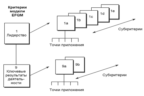 Девять критериев модели совершенствования EFQM содержат 32 субкритерия, детализирующие модель, а в российской модели они называются «составляющими».