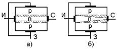 приводит к уменьшению сечения канала на одинаковую величину по всей его длине (рис.5.2 а). При протекании тока через канал создается падение напряжения в направлении стока, что приводит к уменьшению сечения канала от истока к стоку (рис. 5.2. б).