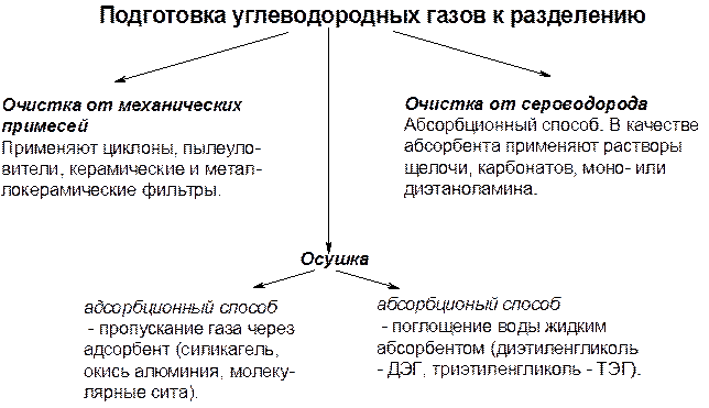 Перед тем как поступить на ГФУ углеводородные газы подвергаются очистке от механических примесей, осушке и очистке от сернистых соединений. Основные способы подготовки углеводородных газов к разделению приведены на рис.16.