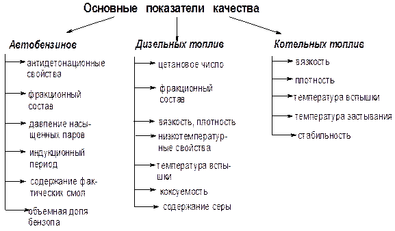 Все топлива, выпускаемые на НПЗ, должны соответствовать государственным стандартам (ГОСТ) или техническим условиям (ТУ). В стандартах и технических условиях указаны показатели качества топлив. Основные показатели качества топлив, характеризующие их поведение при применении, приведены на рис.12.
