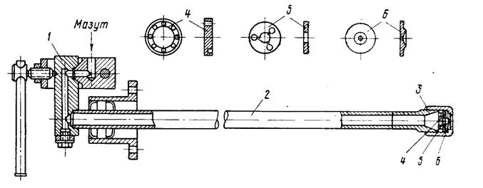 Форсунка состоит из корпуса 1, центральной трубы 2 (ствола) и наконечника 3 с распыливающей головкой. В головке установлены: распределительный диск 4, где поток разделяется на отдельные струйки; завихривающий диск 5 с центральной камерой, в которой происходит завихрение струи тангенциальными прорезями; сопло 6 с диаметром отверстия от 2 до 8 мм в зависимости от производительности форсунки. Топливо подается в форсунку с давлением 1- 4 МПа. Расход топлива составляет 100 - 2500 кг/ч и более.
