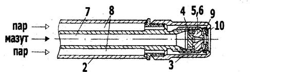 2 – ствол форсунки; 3 – наконечник; 4 и 5– распределительный и завихривающий диски; 6 – сопло; 7 – канал для мазута; 8 – канал для пара; 9 – паровой завихритель; 10 – насадок.