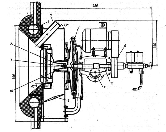 1 – форсунка; 2 – распыливающий стакан, 3 – полый вал; 4 – вентилятор первичного воздуха; 5 – шибер на воздуховоде вторичного воздуха; 6 – клиноременный привод форсунки; 7 – привод топливного насоса; 8 – гляделка; 9 – кольцевой газовый коллектор; питатель.