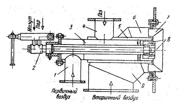 1 –патрубок подвода первичного воздуха; 2 – паромеханическая форсунка; 3 – центральный воздушный канал; 4 –подвод газа; 5– кольцевая газовая камера; 6 - периферийный канал вторичного воздуха; 7,8 - лопаточные завихрители; 9–патрубок подвода вторичного воздуха.