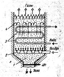 1 – золовой бункер; 2 – воздухораспределительная решетка; 3 – погруженная поверхность нагрева; 4 – кипящий слой топлива.