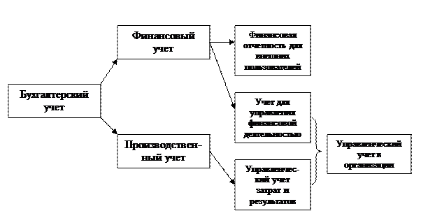 Из приведенной схемы видно, что управленческий учет состоит как бы из двух компонентов: производственного учета,предназначенного для внутреннего управления производством и сбытом продукции, и той части финансового учета, которая служит для управления финансовой деятельностью непосредственно в организации.